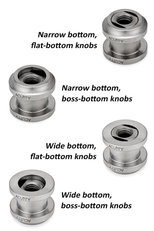 Gone are the days of sagging shift boots, broken plastic shift boot collars, and shift boot collars that don't match the diameter or style of your shift knob. ACUITY designed this Shift Boot Collar Upgrade to allow use of virtually any M10x1.5 shift knob in your Honda without sacrificing fit and finish between the shift boot and shift knob. This kit includes 2 binding nuts, one meant for flat-bottomed knobs, and the other meant for boss-bottomed knobs (like modern Civic Type R and Honda Factory Performance designs). The boot collar is reversible and can be flipped to match your knob's base diameter, whether it be a traditional narrow-bottomed knob (with a 22mm lower diameter) or the newer style wide-bottomed knobs (with a 28mm lower diameter). An integral retaining feature lets you easily pop the boot collar on and off many times without problems, so you no longer have to worry about breaking the OEM plastic boot ring when removing your shift knob. The supplied binding nuts are turned and milled from stainless steel and have flats for a 12mm open-ended wrench. The boot collar is made from 300 series stainless steel and is all markings are laser etched.