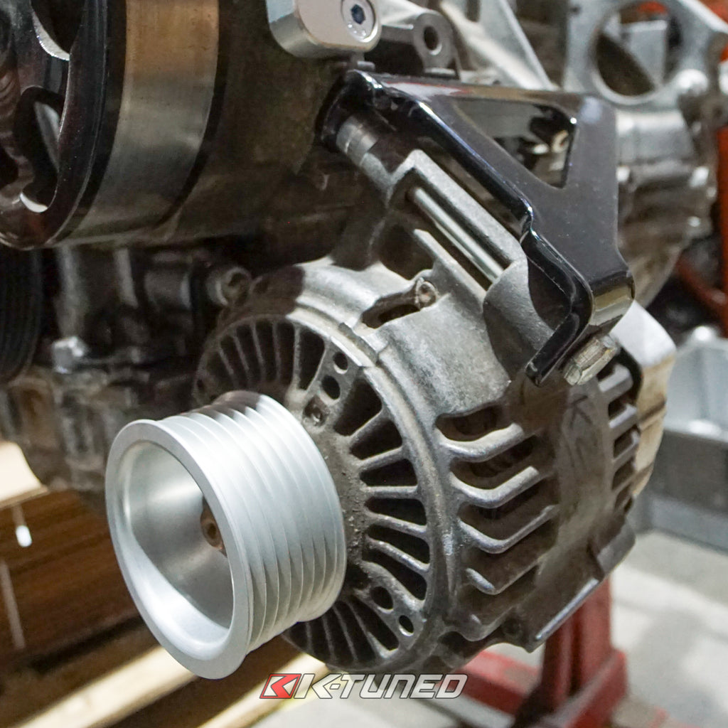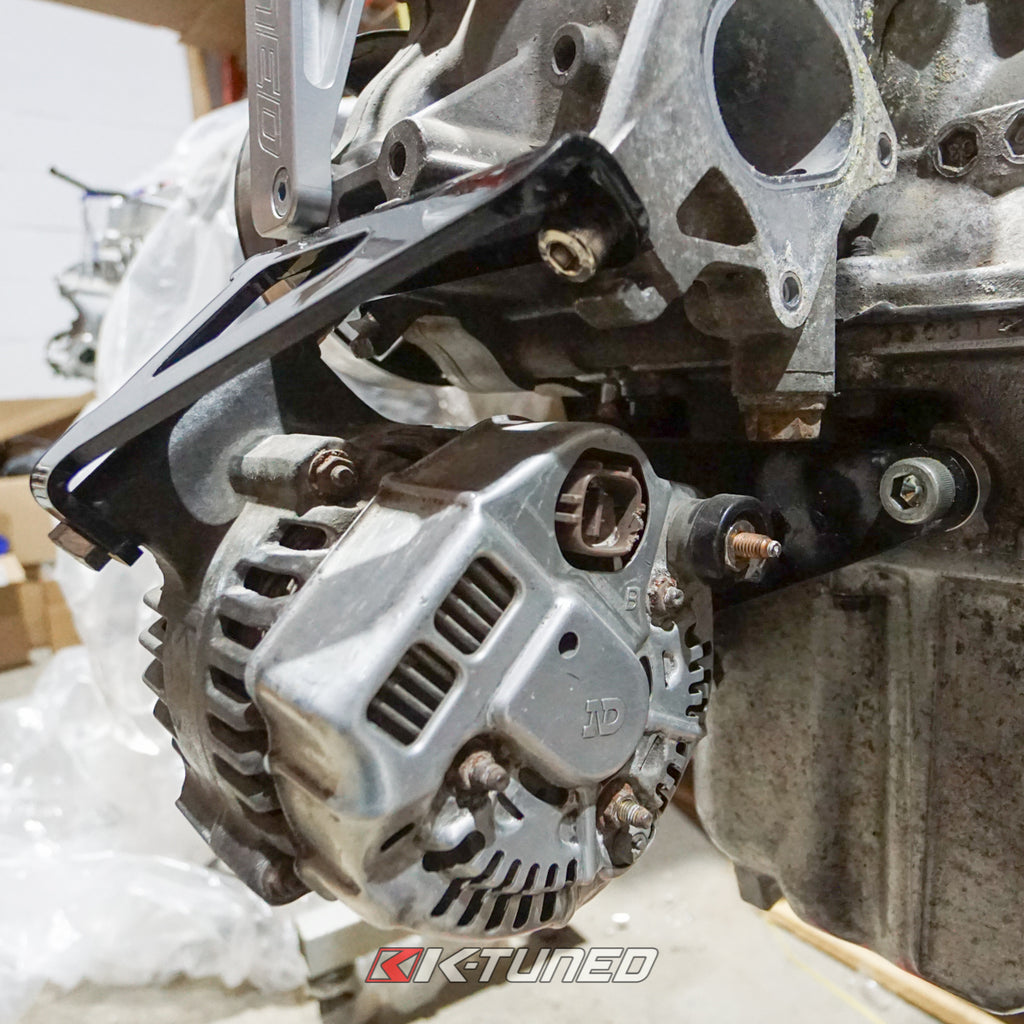 The K-Tuned A/C & P/S Eliminator Kit deletes A/C, P/S and the factory belt tensioner from the engine. The alternator is then relocated lower and moves to the original A/C location, to increase clearance on even the tightest K-swap chassis. This part is particularly useful for EF K-swaps because it offers some much needed headlight clearance. If you want, you can even cut off the mounting tab that was used for the original tensioner. Doing this, allows ITBÍs and custom intake manifolds to be fitted very easily.